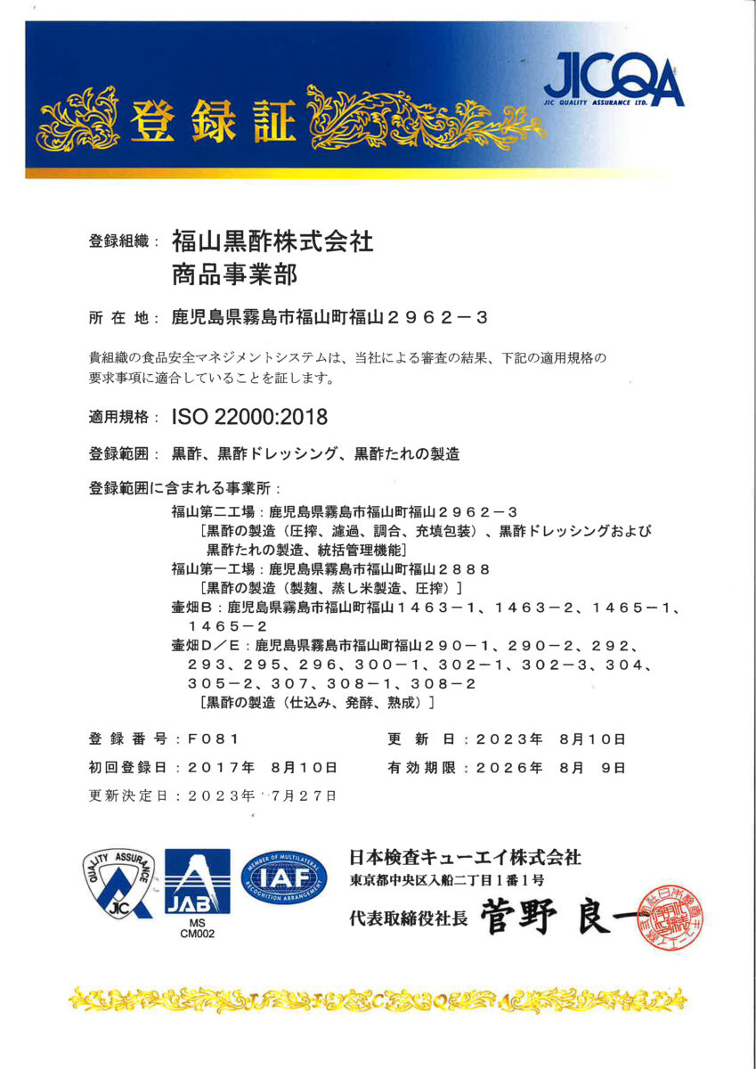 福山黒酢株式会社は、2017年より食品安全マネジメントシステムの国際規格であるISO22000:2018の認証を取得しております。
